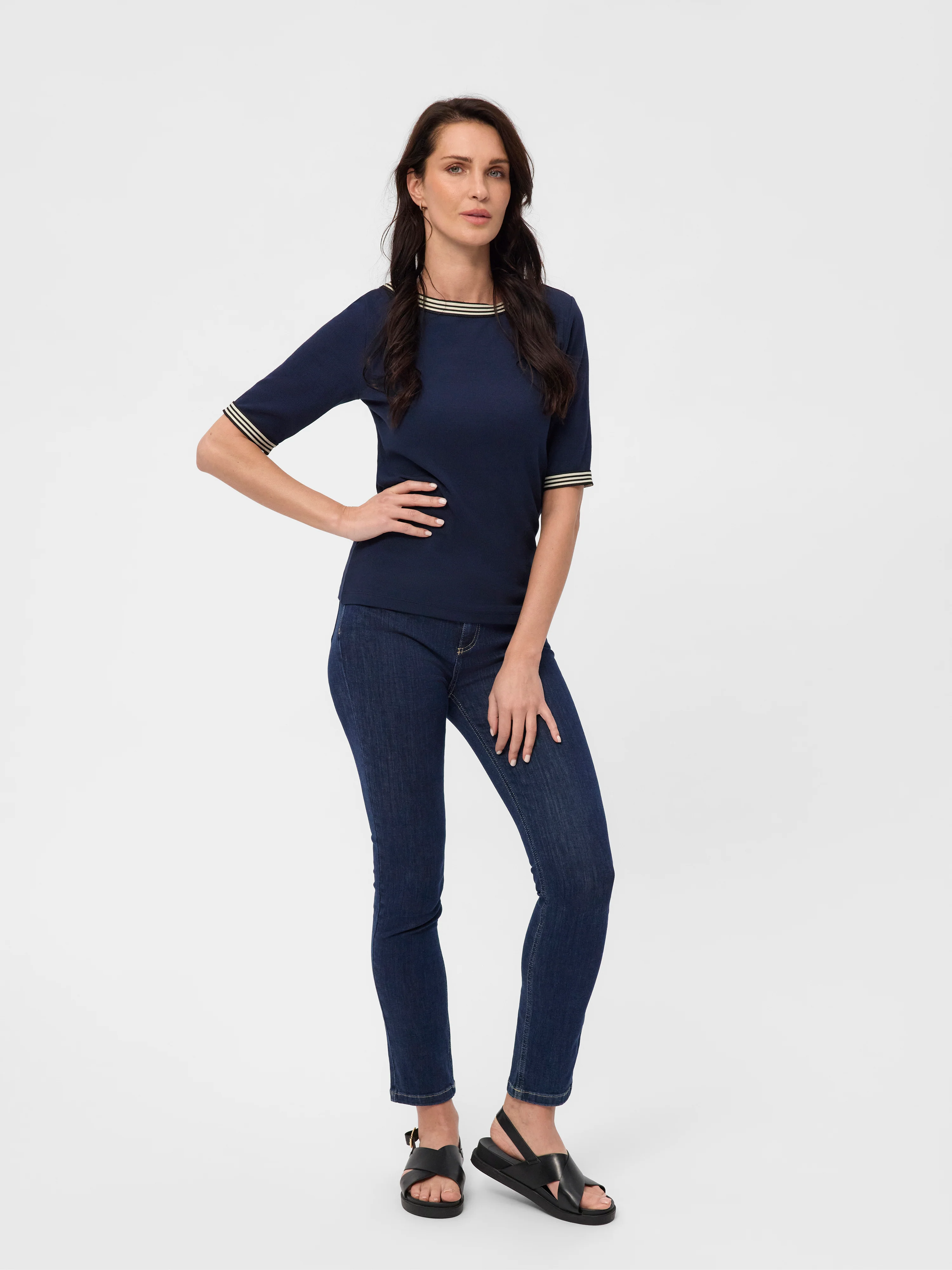 Elegant og komfortabel T-shirt med fine kontrastdetaljer, fremstillet i en blød og strækbar kvalitet. En alsidig T-shirt, der fungerer både til hverdag og mere pæne anledninger.